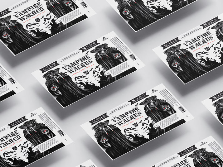 Tasked with creating a distinctive label for NoDa Brewing Company's double IPA, Vampire Walrus, I was given full creative freedom to develop the concept and execution. I crafted a custom illustration of a vampire-inspired walrus, balancing quirky personality with bold visual appeal. The design was paired with hand-drawn typography to complement the character and enhance shelf presence.
